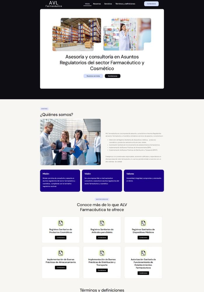 AVL Farmacéutica es una empresa de asesoría y consultoría en Asuntos Regulatorios del sector Farmacéutico y Cosmético, brindamos servicios de asesoría y consultoría en: Obtención de Registros Sanitarios de dispositivos médicos, productos cosméticos y productos sanitarios artículos para bebés. Autorización Sanitaria de funcionamiento de establecimientos farmacéuticos. Implementación de Buenas Prácticas de Almacenamiento (BPA). Implementación de Buenas Prácticas de Distribución y Transporte (BPDT).