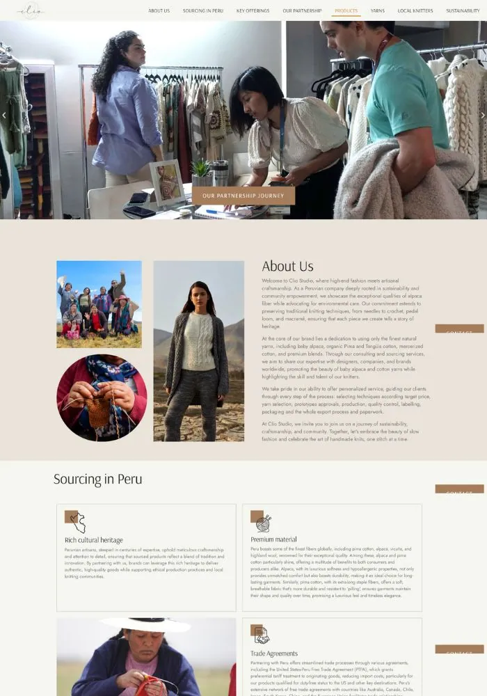 Clio Studio es un lugar donde la moda de alta gama se fusiona con la artesanía. Como empresa peruana profundamente comprometida con la sostenibilidad y el empoderamiento comunitario, Clio Studio destaca las cualidades excepcionales de la fibra de alpaca mientras promueve el cuidado del medio ambiente. El compromiso de Clio Studio se extiende a preservar las técnicas tradicionales de tejido, desde agujas hasta crochet, telar de pedal y macramé. Cada pieza creada cuenta una historia de herencia, asegurando que la tradición y la calidad se mantengan en cada creación.