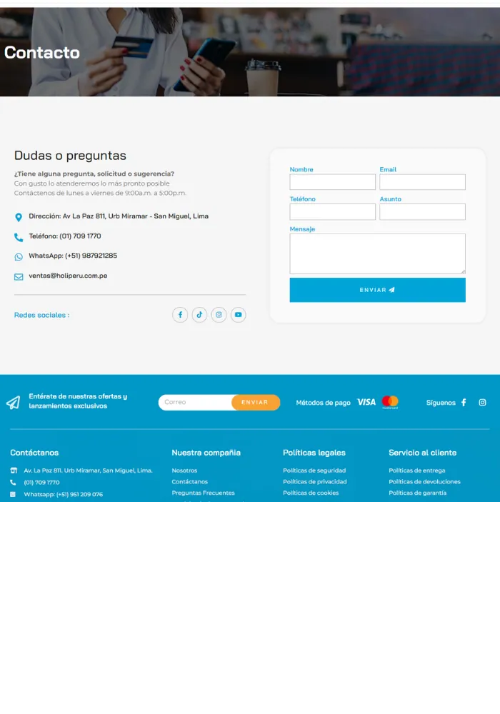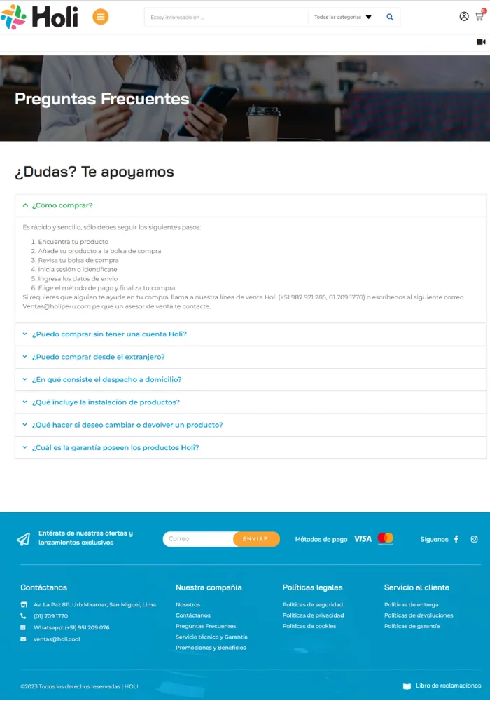 HOLI es una marca peruana que comercializa productos de alta calidad a bajo costo, a su cargo se encuentra un equipo humano con gran experiencia en la distribución y comercialización de productos, así como en la ejecución de diversos servicios.